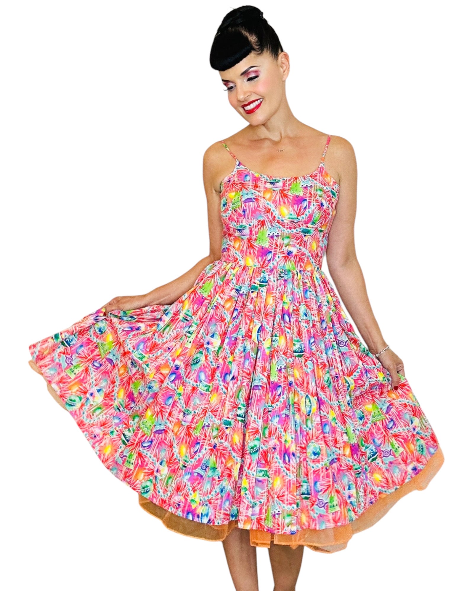 Chelsea Dress in Tinsel Town is a red & silver very retro 50's style print!