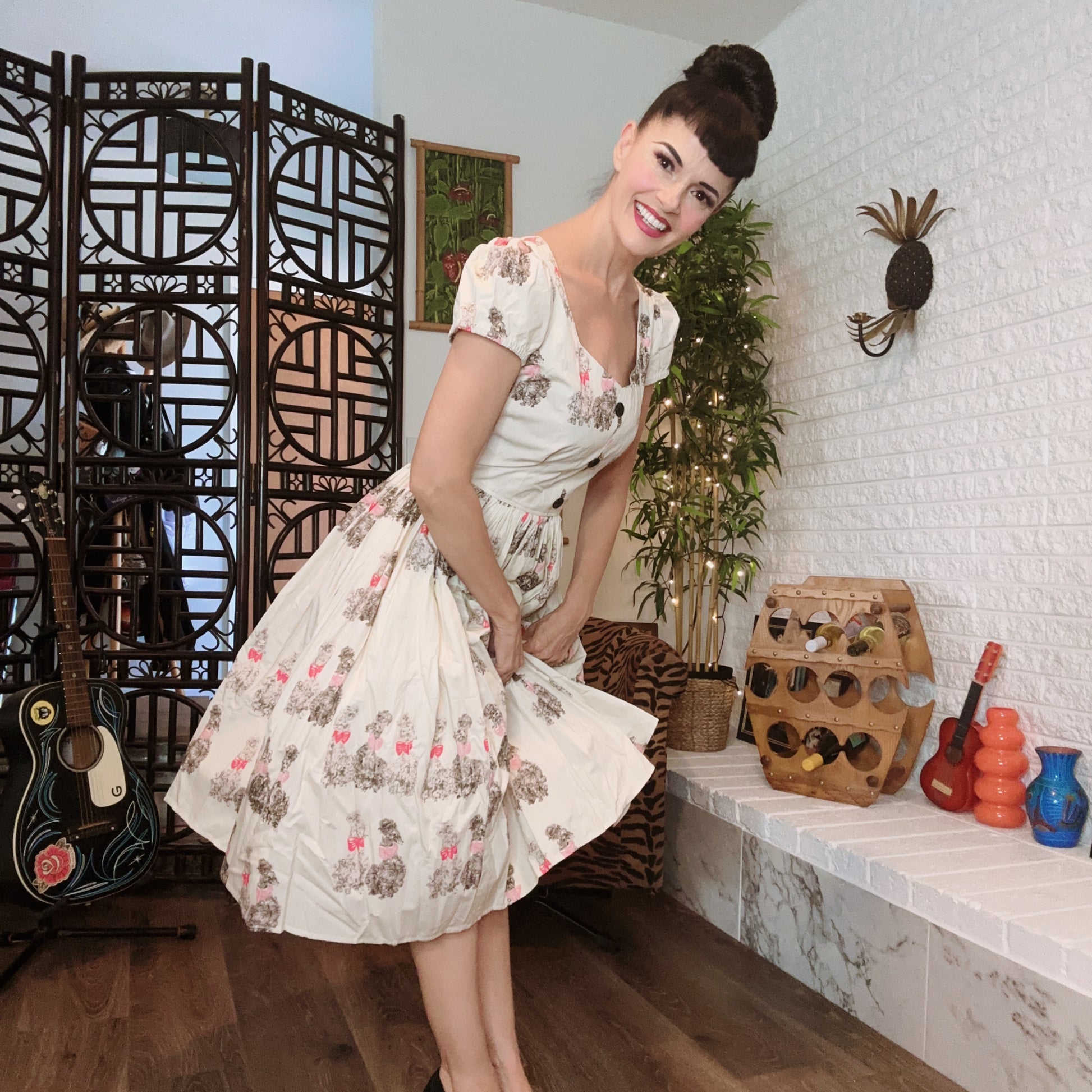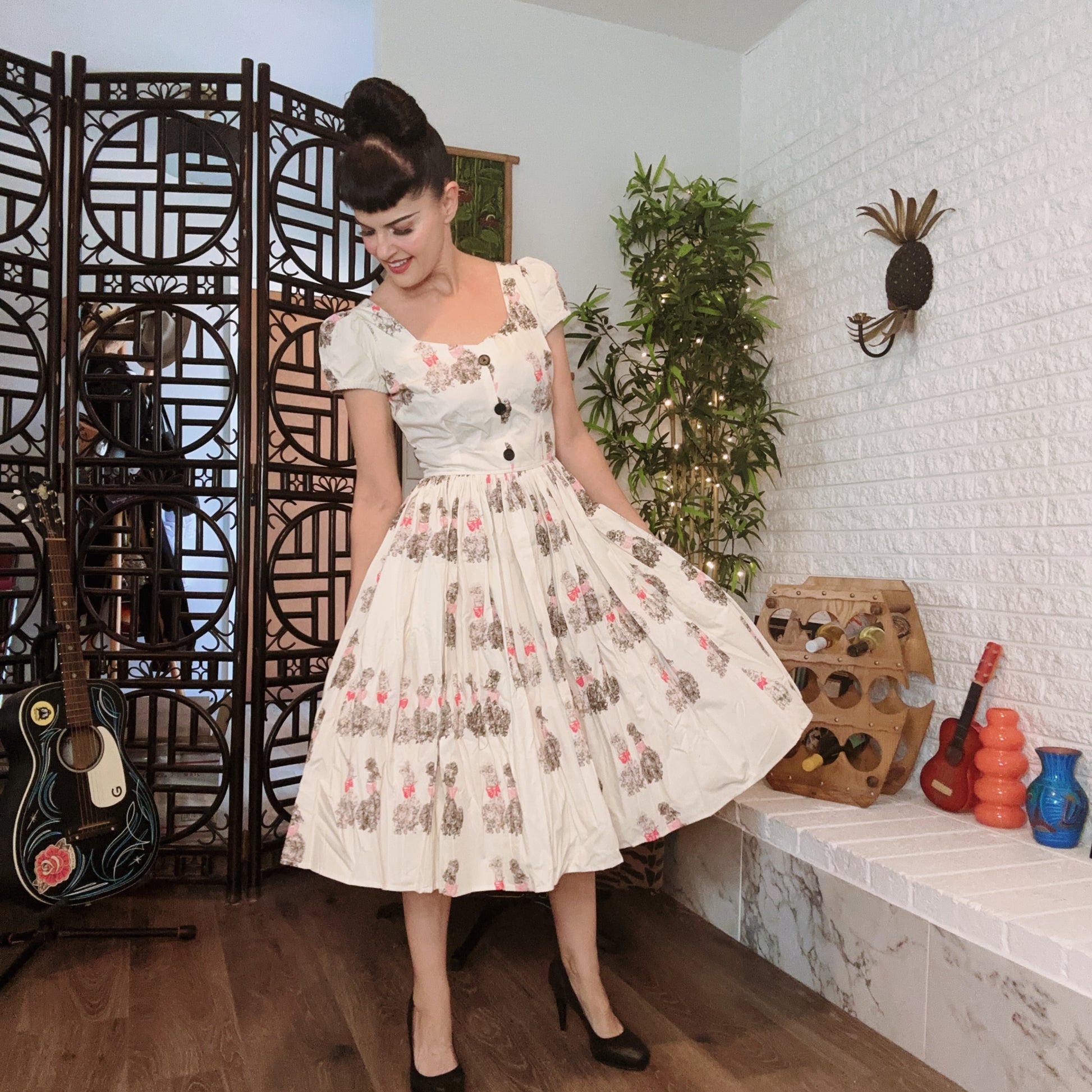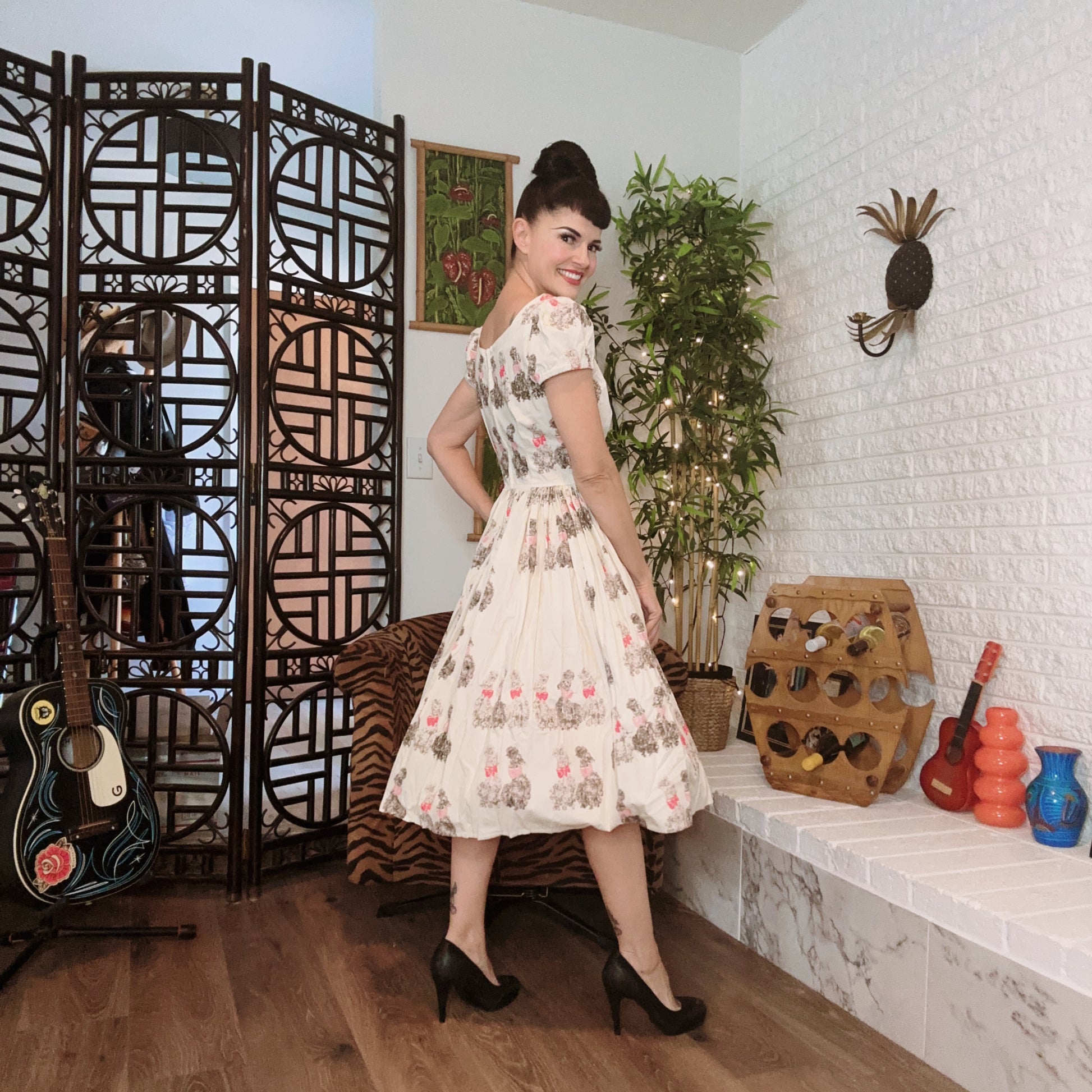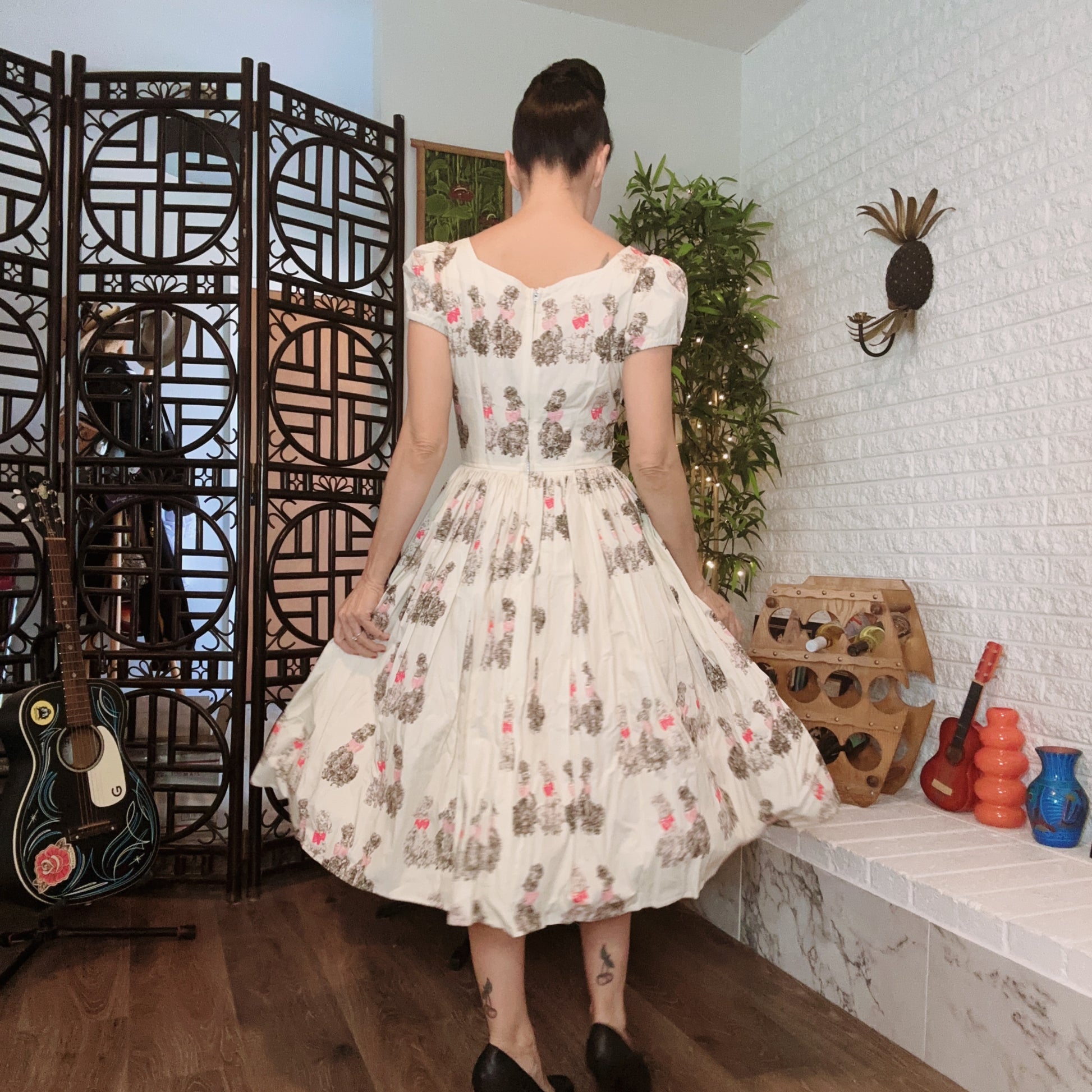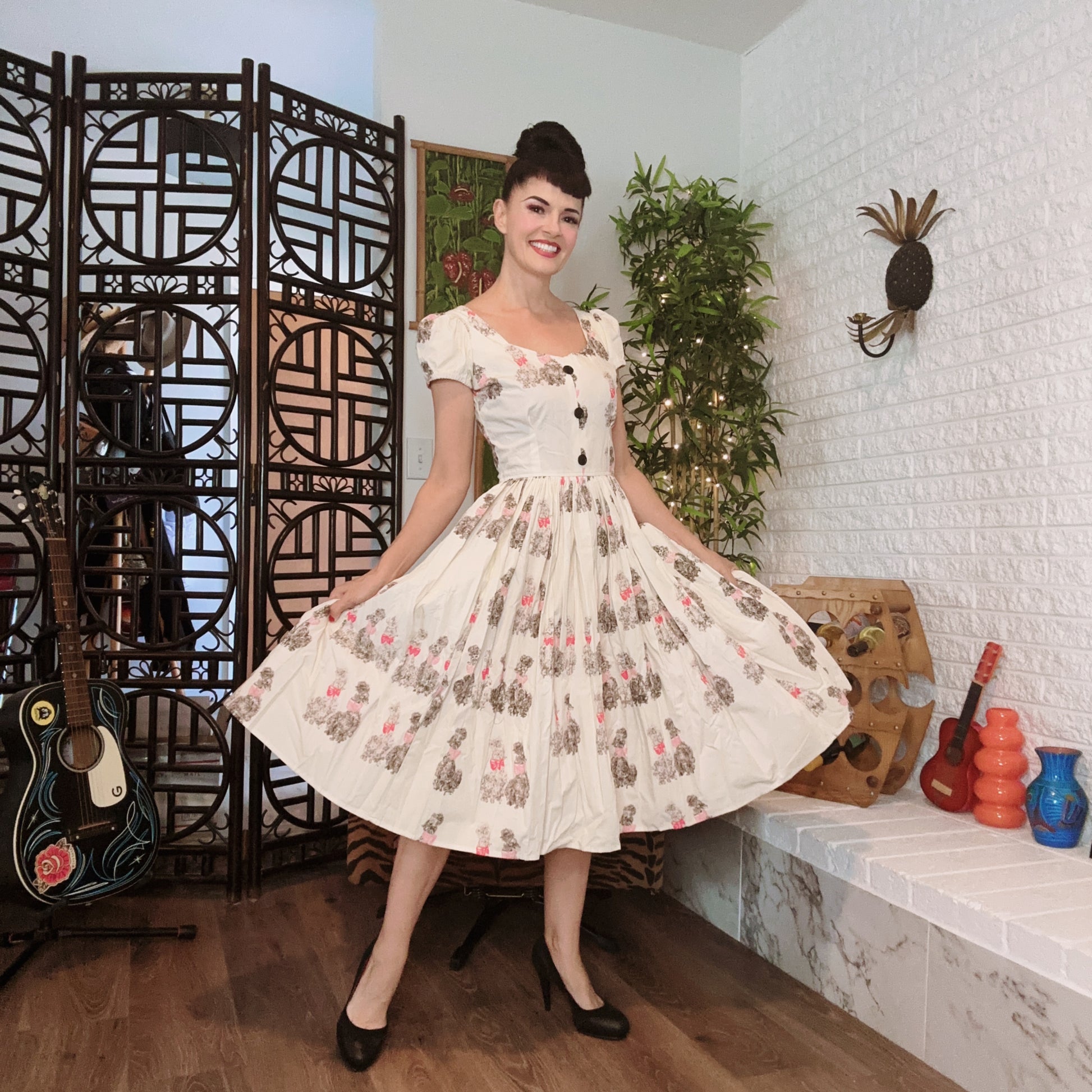 It features a zipper in back and hidden pockets. The beautiful retro poodle print . It is 100% cotton.